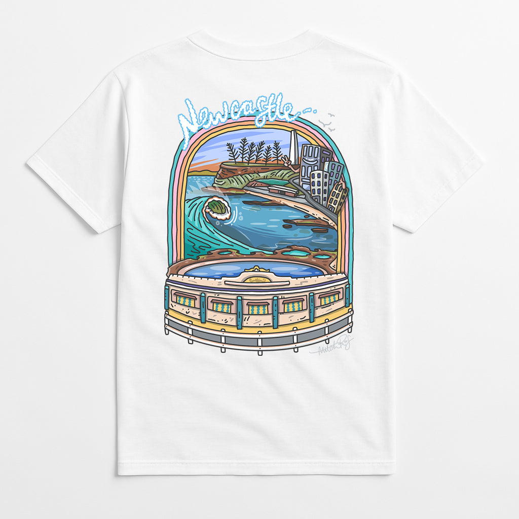 Introducing the highly-anticipated 2026 Calendar showcasing 12 of Mitch's iconic "Crowd Favourite" illustrations of Newcastle's local beaches and landmarks. This year's calendar includes a "Find it" element, for you to enjoy looking for things Mitch has hidden throughout each month's artwork.