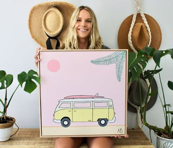 Charlotte uses acrylic paints onto stretched canvas. To finish, they are framed with Tasmanian oak