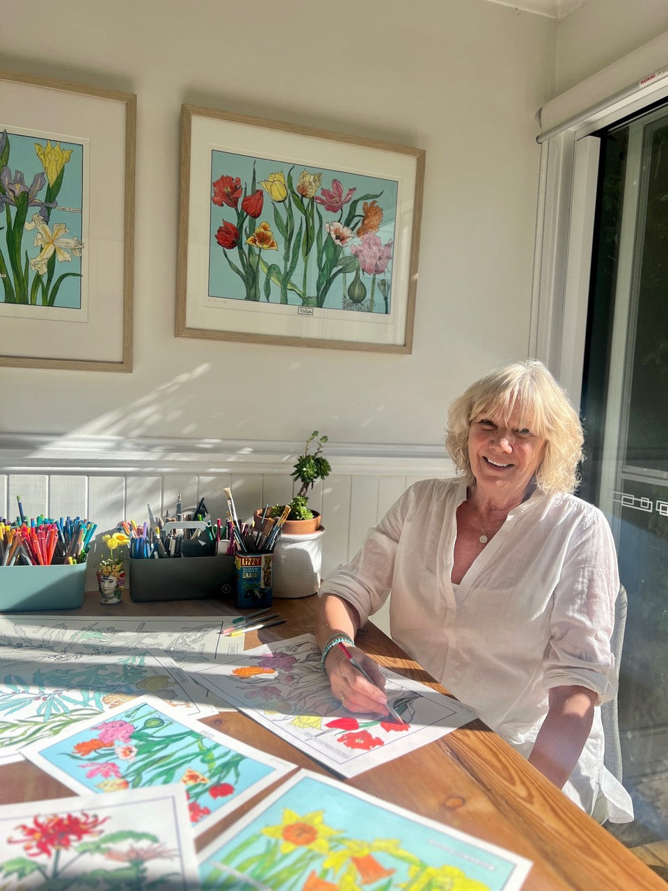 “Inspired by the English gardens of my youth, my process, drawing, printing, and hand-colouring, pays homage to the detail of historical botanical engravings while embracing the fluidity and spontaneity of contemporary art.”